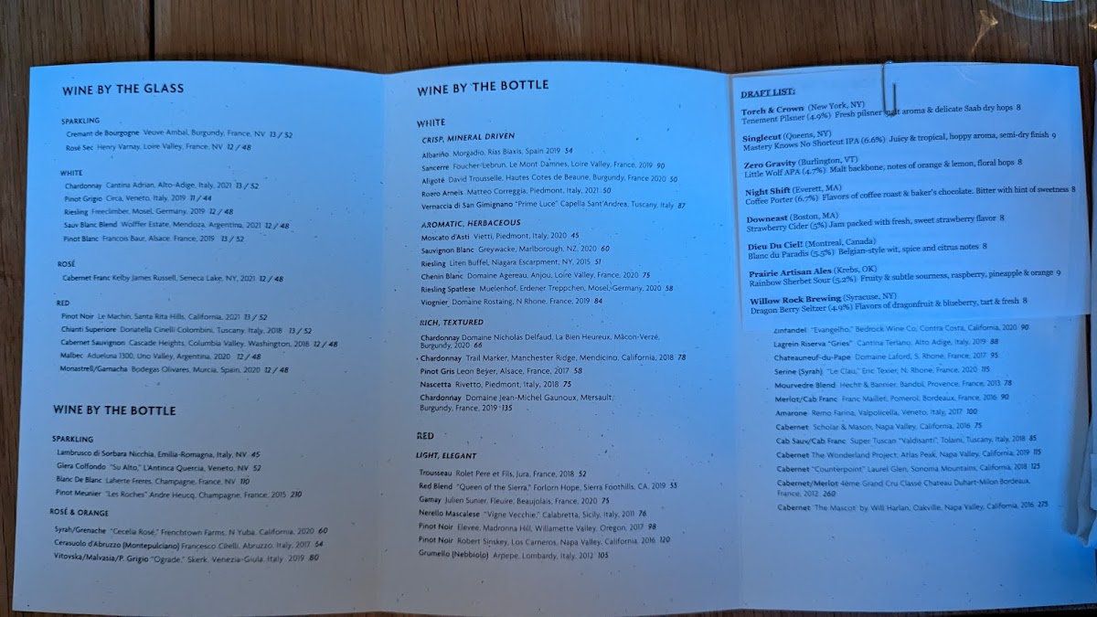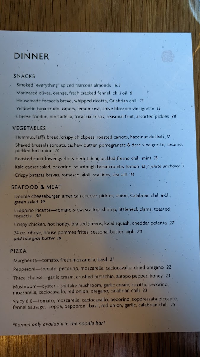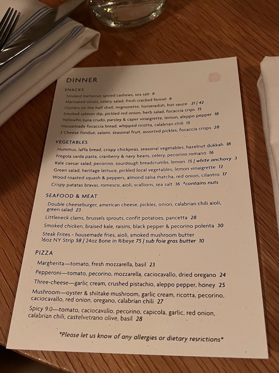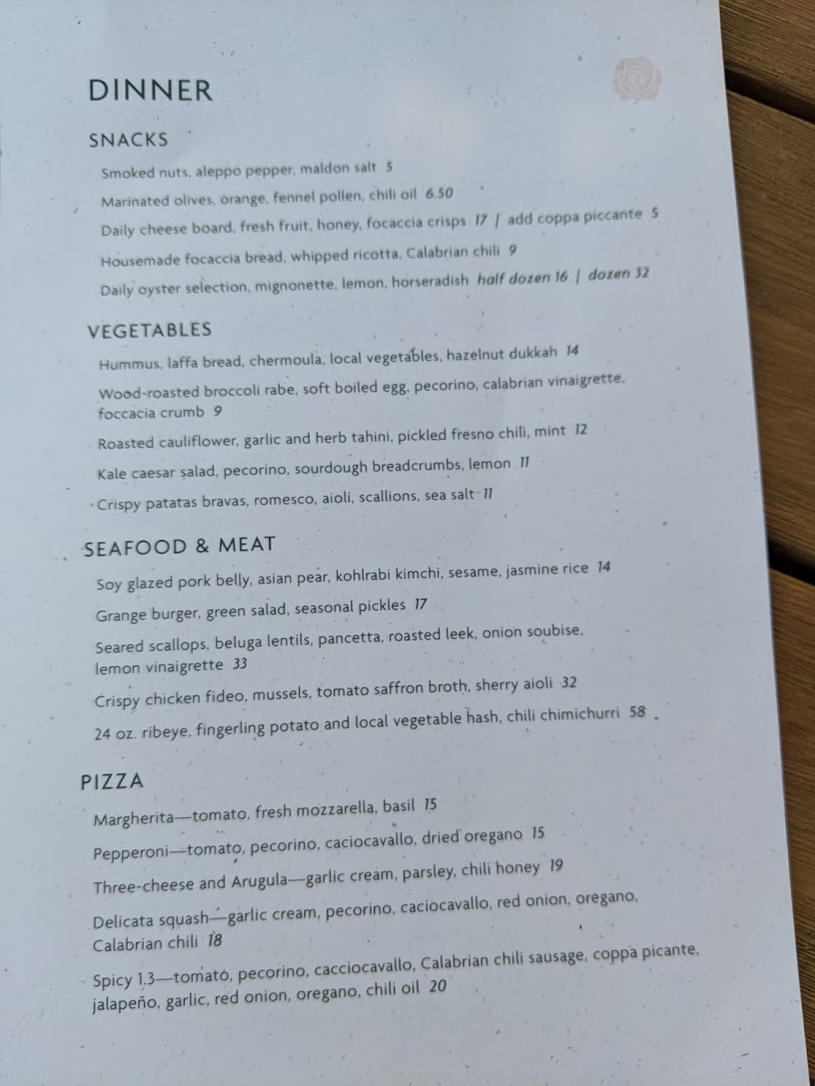 The menu features a variety of small plates and heartier options that complement the warm, inviting atmosphere. Guests often enjoy dishes like the kale salad or focaccia bread with whipped ricotta as light starters, while items such as the chicken and rice stuffed pepper or schnitzel provide more substantial choices. The daily oyster selection and carpaccio bring a fresh, delicate element suited to sharing and leisurely meals.